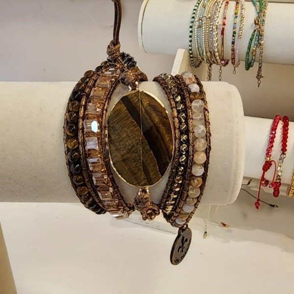 Collar tejido a mano con cristales y piedras naturales, una pieza especial que combina textura, brillo y presencia. Su diseño versátil permite usarlo tanto como collar largo como pulsera, adaptándose a diferentes estilos y ocasiones.