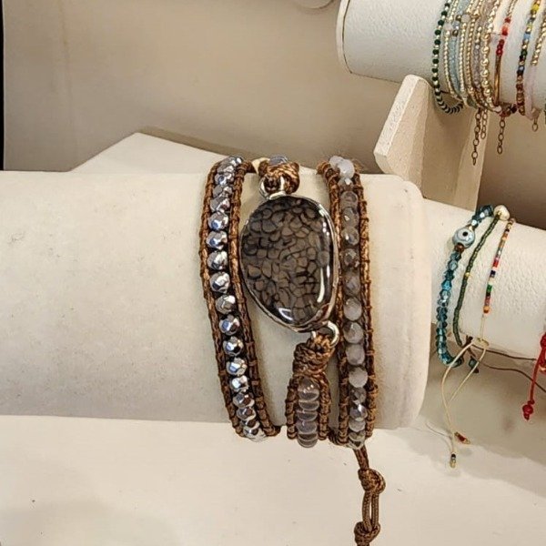 Collar pulsera tejido a mano con una combinación de cristales y piedras naturales que aportan textura, brillo y carácter a la pieza. Su diseño versátil permite usarlo como collar o como pulsera, adaptándose fácilmente a distintos estilos.